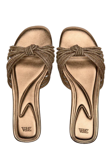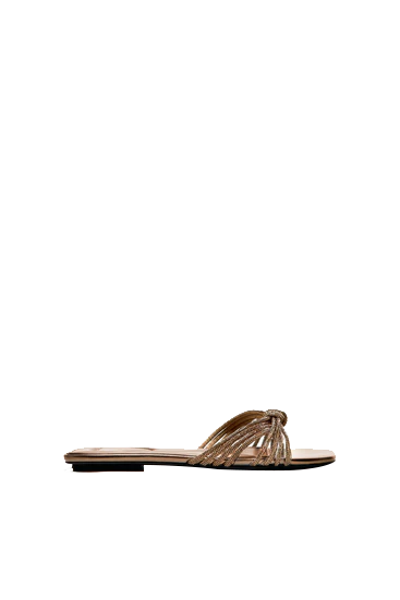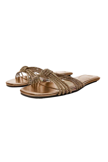 Flat slider sandals with knot and rhinestone details. Round toe.