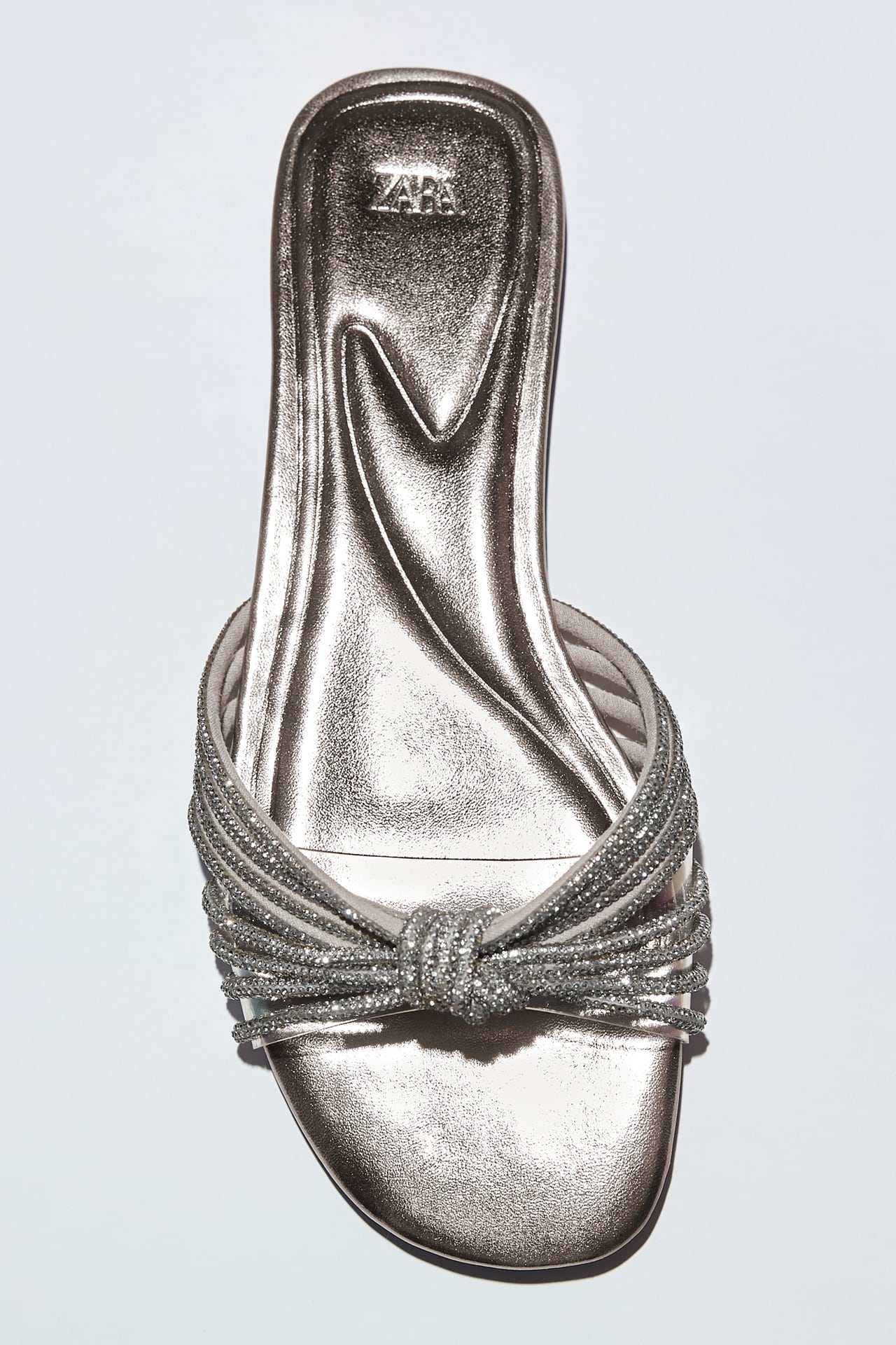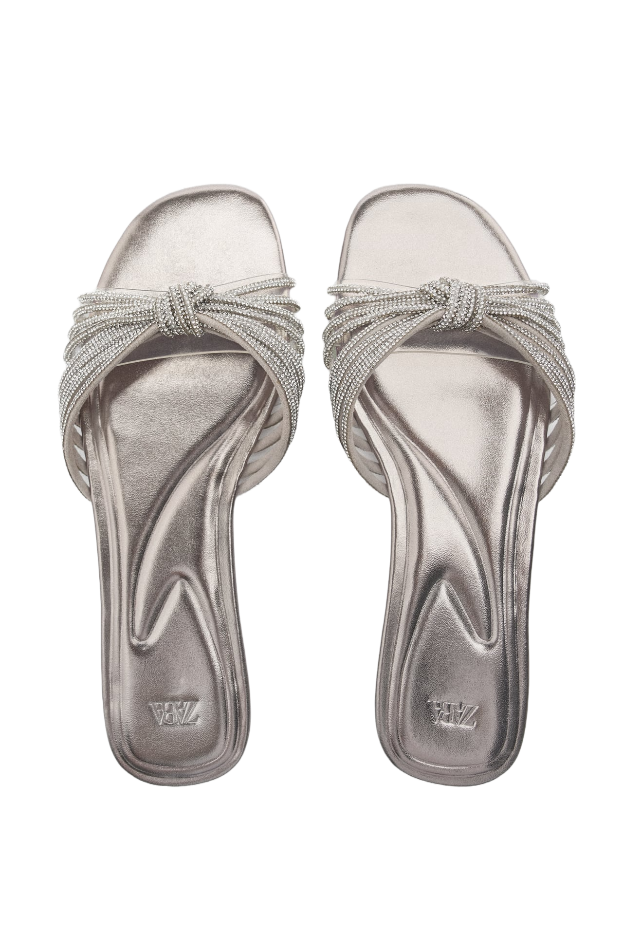 Flat sandals with rhinestones. Straps and knot detail on the front.