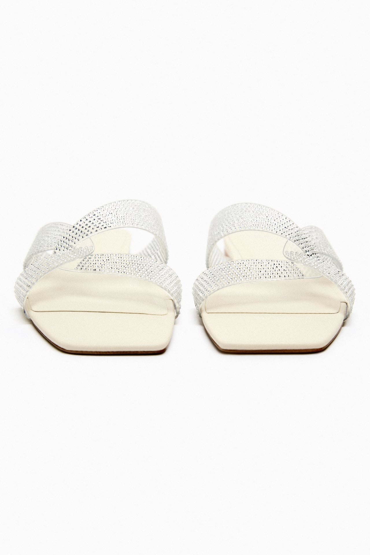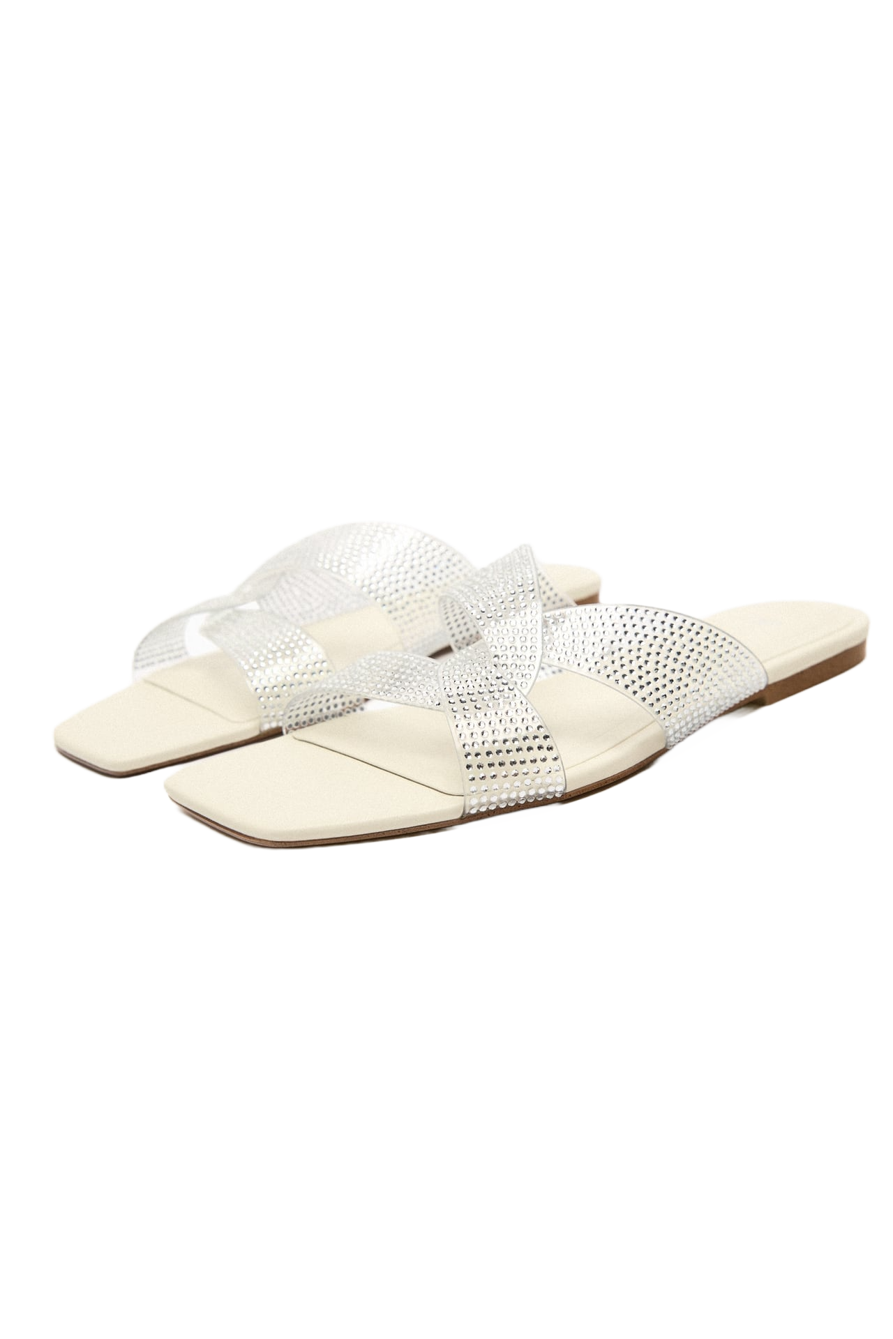 Flat vinyl slider sandals with rhinestones. Square toe.