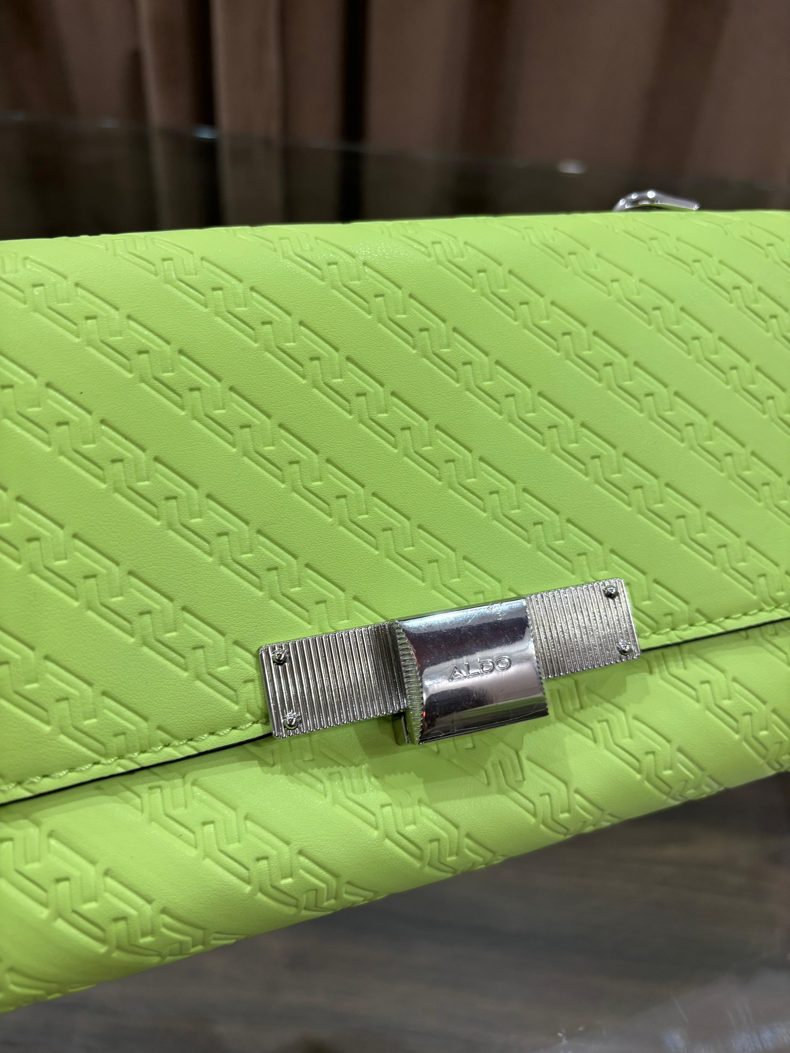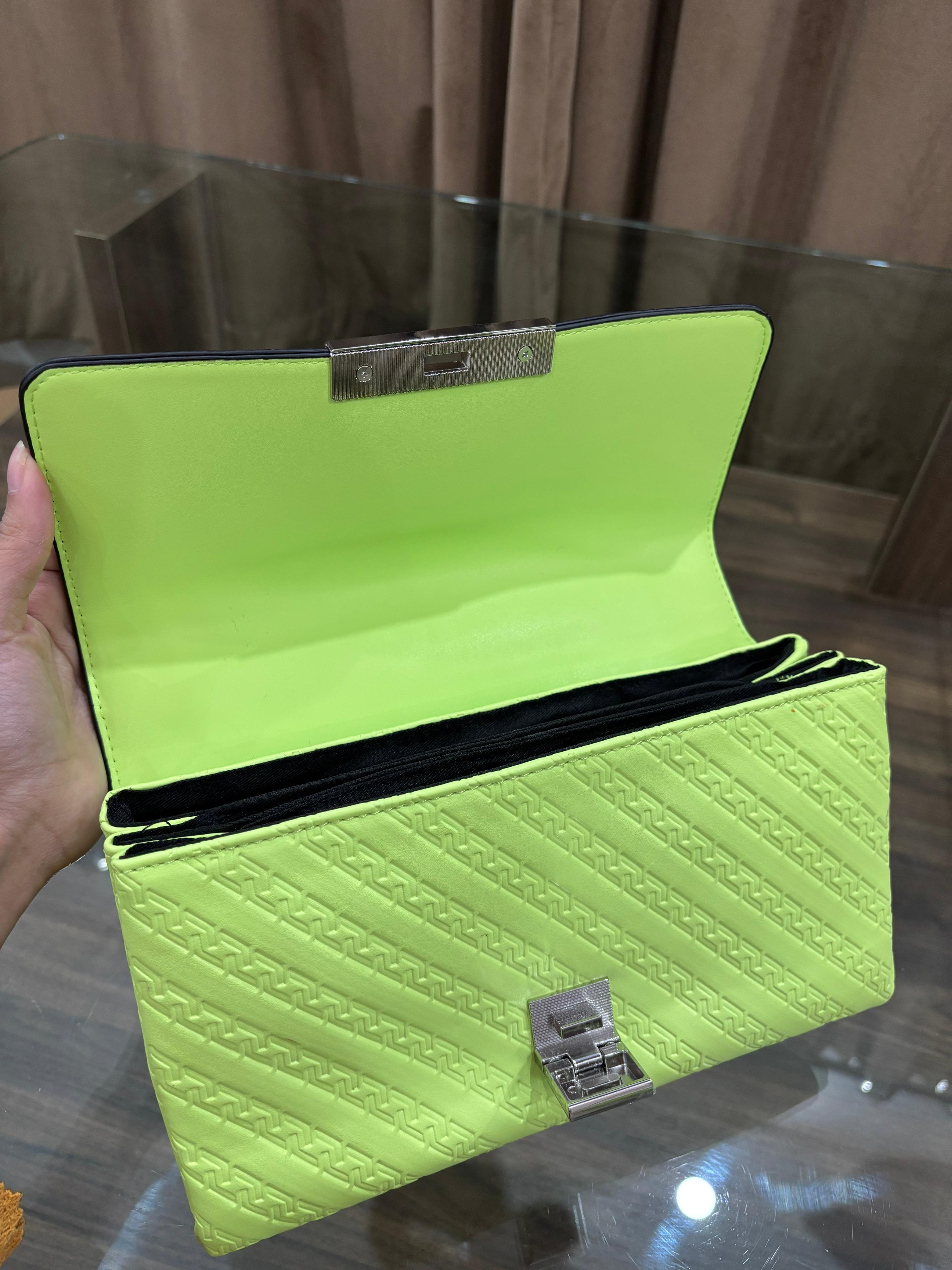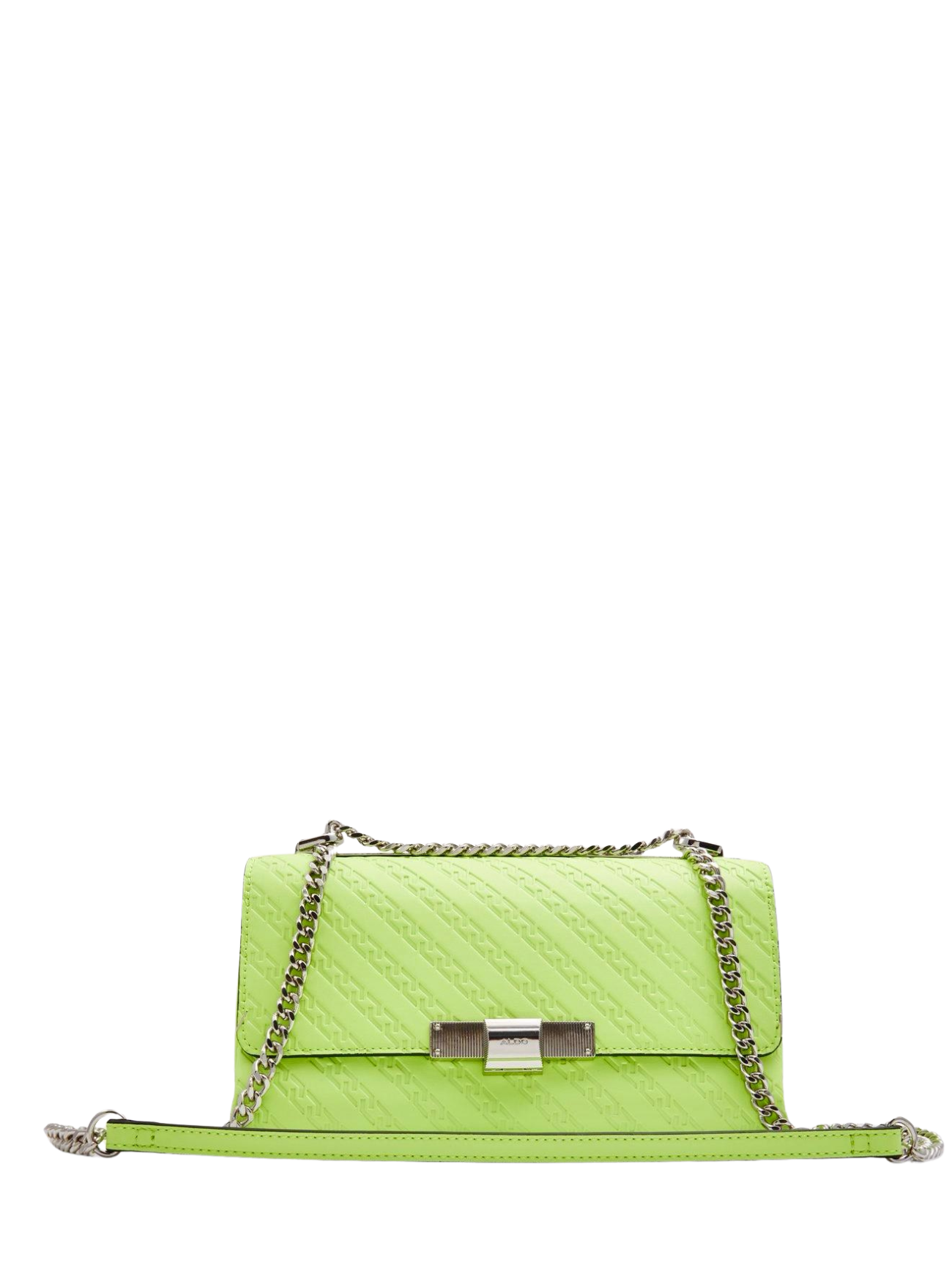 This sleek embossed bag with 3 interior compartments can be worn crossbody or on the shoulder courtesy of an adjustable chain strap. Versatility at its finest! Details Colour Green Non-removable chain strap Measurements Strap Drop Length: 23.0 cm Materials Embossed Metal detail