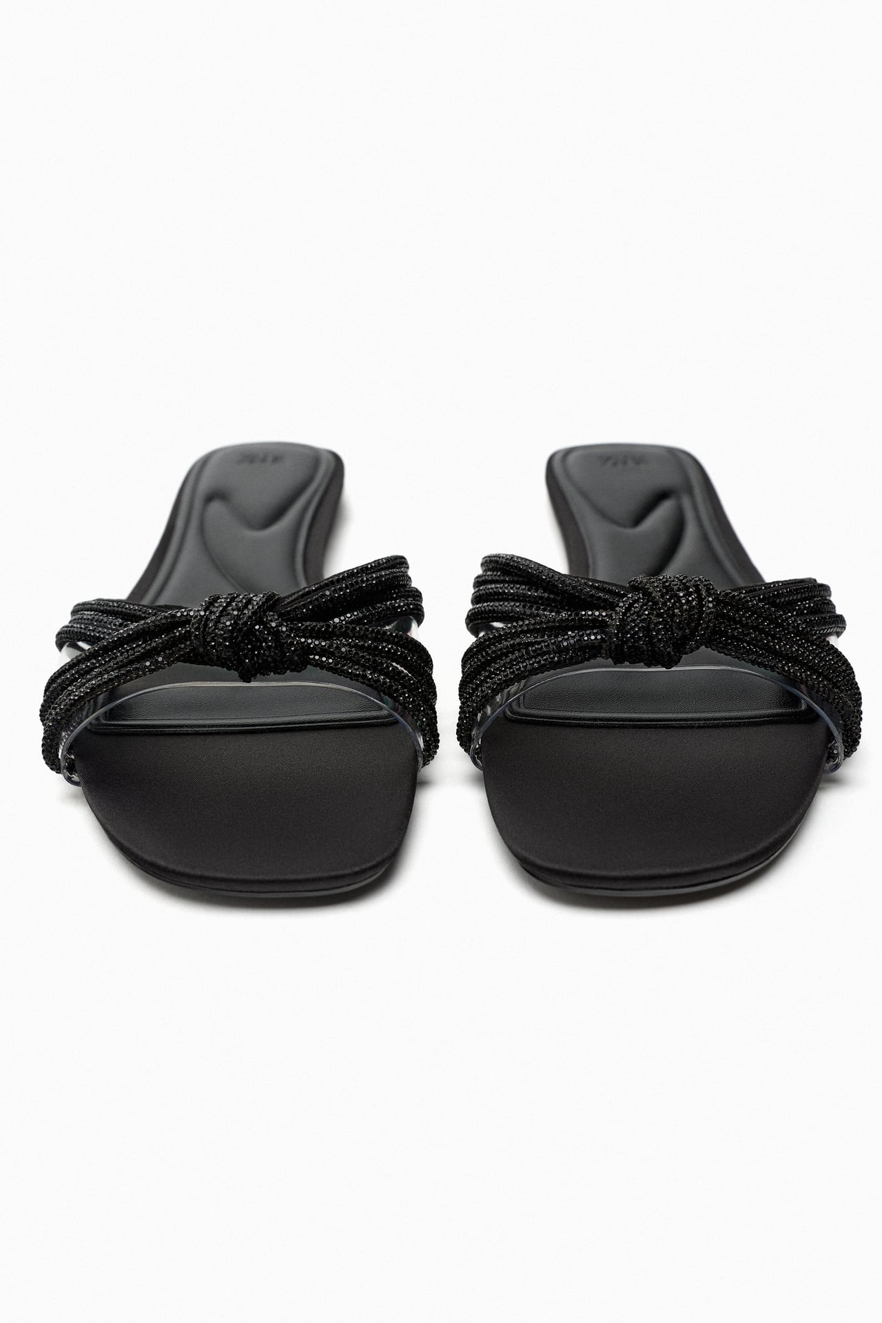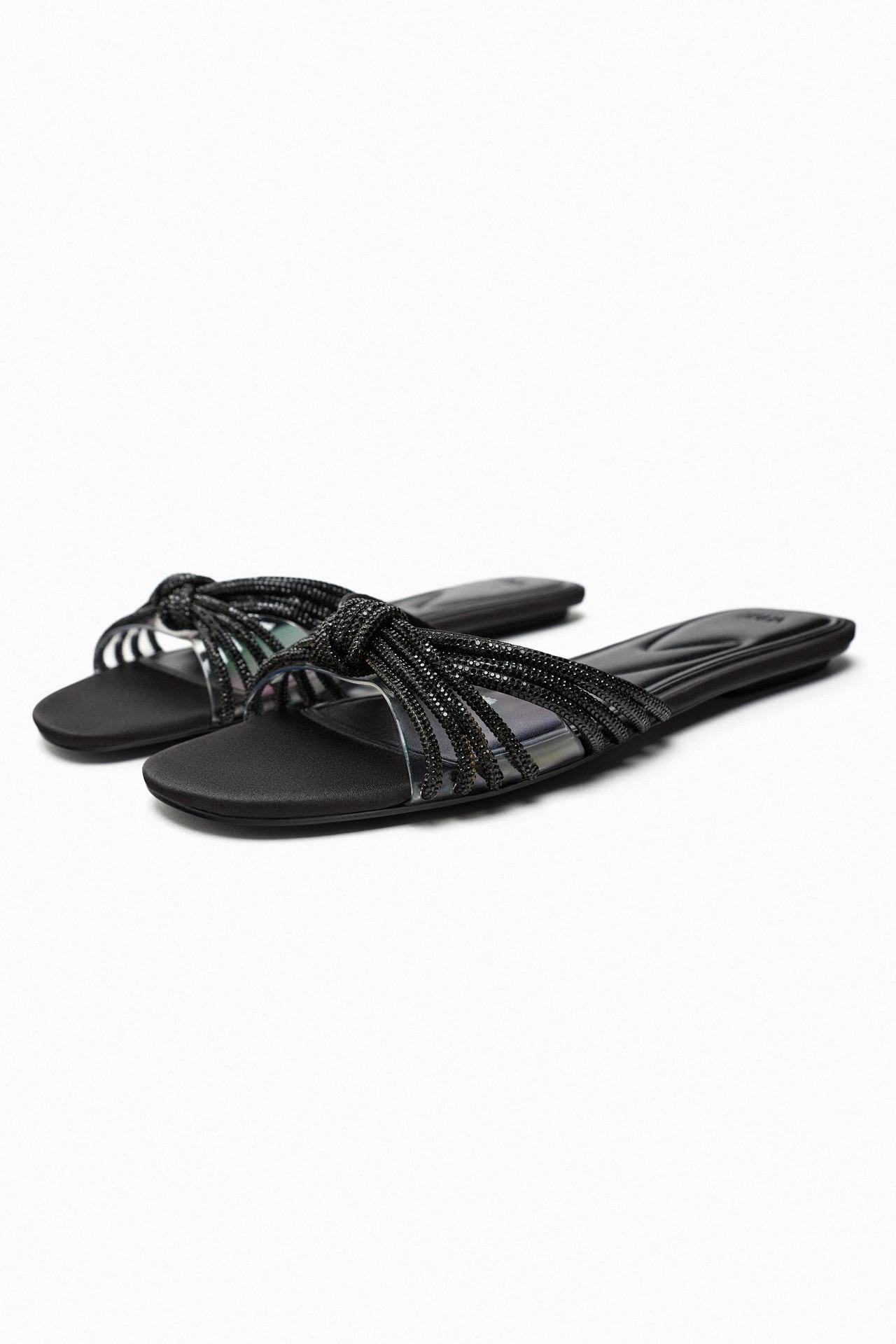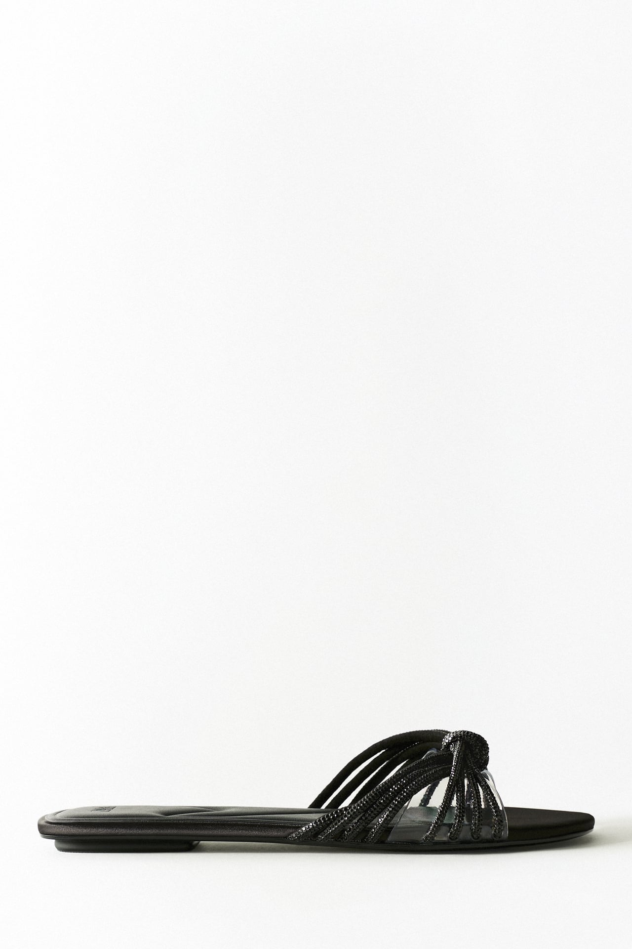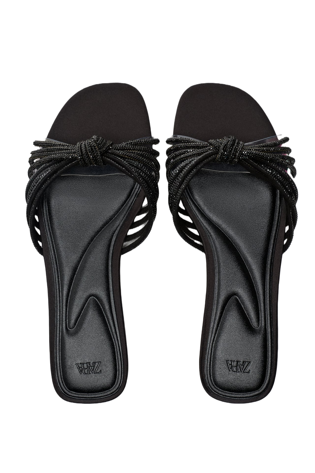 Vinyl slider sandals. Strap details and knot on the front. Square toe.